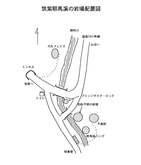 福岡市中心部を流れる那珂川の上流に位置する筑紫耶馬溪は、近郊の行楽地として福岡市民に親しまれ、また多くのボルダーの存在が報告されている。一方、フリークライミングの対象となる花崗岩の岩壁もいくつか存在する。この岩場は、福岡市内に近いこと、アプローチが短いこと、冬期でも登攀可能といった利点を持っており、もっと利用されてよい岩場である。しかし、風化が進んでいるために岩質が柔らかく、フレイクなどがガバッと壊れることがあるという点、初心者向きのルートが少ないという欠点も持っている。古くなるが、「岩と雪」128号、129号にルート開拓の報告が出ている。二つの資料によると、岩場は、不動岩、耶馬溪ハング、ブリッジサイド・ロック、力丸フェイスに大別される。ただし、不動岩の位置についてはっきりしない部分がある。