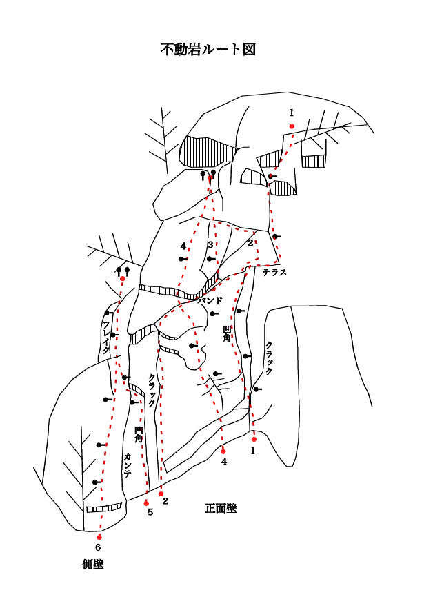 不動岩の右下に位置するオーバーハングを抱えた高度差20m弱の岩壁。取り付き点は河原。ハングの乗り越しが核心をなすルートが数本開かれていたが、現在では小灌木と苔に覆われた上に、ピンも腐食し登攀不可能となった(トップロープならば登攀可能だが、苔落としをしなければならない)。岩場は定期的にメンテナンスをしなければならないという典型的な見本である。再び登攀可能になることを期待する。