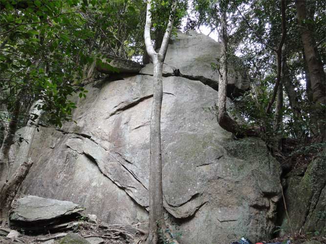 岩壁右のラインを成すカンテをフレイク状のクラック伝いに登る。取り付きは、岩壁の右を回り込み、斜面を一段上った地点。入り口が嫌らしく、右へ回り込んだところからレイバックで入るのがベター。レイバックを交えながら登り、最後は甘いピンチホールドに耐える。終了点近くにボルトが2本設置してあるが(トップロープ支点?)、強度に不安を感じる。現在の所ピンが無く、トップロープ課題。