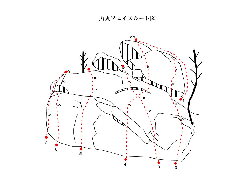 壁から突き出た灌木の下から取り付き、8m登った所からカンテをホールドにして上に抜ける。下から見ると上部フェイスにはホールドが無いように感じるが、指先が掛かるホールドが連続している。途中から右方カンテに繋ぐことも出来る。